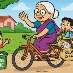 अगले दिन दादी और पोती साईकिल पार्क जा रही थीं। रास्ते में दादी ने देखा कि कई प्लास्टिक की बोतलें और पुराने अख़बार सड़क पर फेंके हुए थे। दादी कुछ पल रुकीं, फिर पार्क में खेल रहे बच्चों को पास बुलाया।
